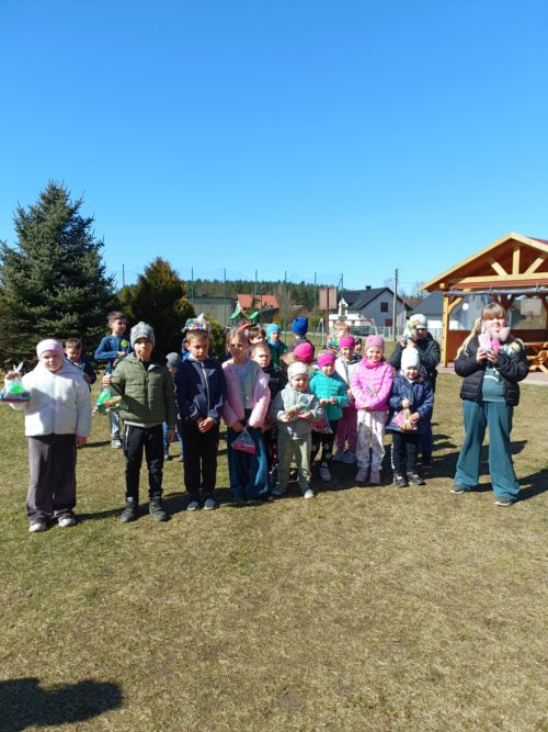 W przedświątecznej atmosferze nasi uczniowie wzięli udział w wyjątkowym wydarzeniu – poszukiwaniu Wielkanocnego Zajączka. Był to dzień pełen ruchu, uśmiechu i wspólnej zabawy na świeżym powietrzu. Przygoda rozpoczęła się od tajemniczego listu, który – jak się okazało – zostawił sam Zajączek Wielkanocny. W liście zawarł wskazówki oraz zadania, które należało wykonać, aby odnaleźć ukryte przez niego niespodzianki. Uczniowie wyruszyli na spacer po najbliższej okolicy szkoły, pełni entuzjazmu i ciekawości. Podczas wędrówki dzieci realizowały kolejne zadania z listy. Wspólnie śpiewały piosenki, co wprowadziło wszystkich w radosny nastrój. Uważnie obserwowały przyrodę, szukając oznak wiosny – kwitnących kwiatów, zielonych pąków na drzewach czy śpiewających ptaków. Nie zabrakło także tropienia śladów Zajączka czy naśladowanie skoków zająca, które dostarczyło dzieciom mnóstwo śmiechu i energii. Po wykonaniu wszystkich zadań dzieci wróciły na teren szkoły. Tam czekało na nich ostatnie wyzwanie – odnalezienie ukrytych upominków. Poszukiwania były pełne emocji, a radość z odnalezionych niespodzianek była ogromna.