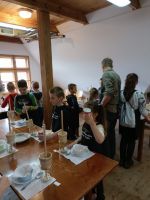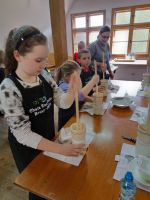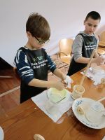 Kolejną część warsztatów było wyrabianie masła. Zwykle robi się to przy pomocy maselnicy. Dzieci wykonywały tę czynność ręcznie, w specjalnym słoju. Proces wyrabiania polegał na ubijaniu śmietany, aż zacznie się oddzielać maślanka od masła. Na końcu warsztatów dzieci degustowały maślankę, a masło zabrały do domów. Wszystkie dzieci były zachwycone i podekscytowane opowieściami, pokazem starodawnych przyrządów kulinarnych oraz możliwością samodzielnego wykonania masła. Było przy tym dużo zabawy i śmiechu.