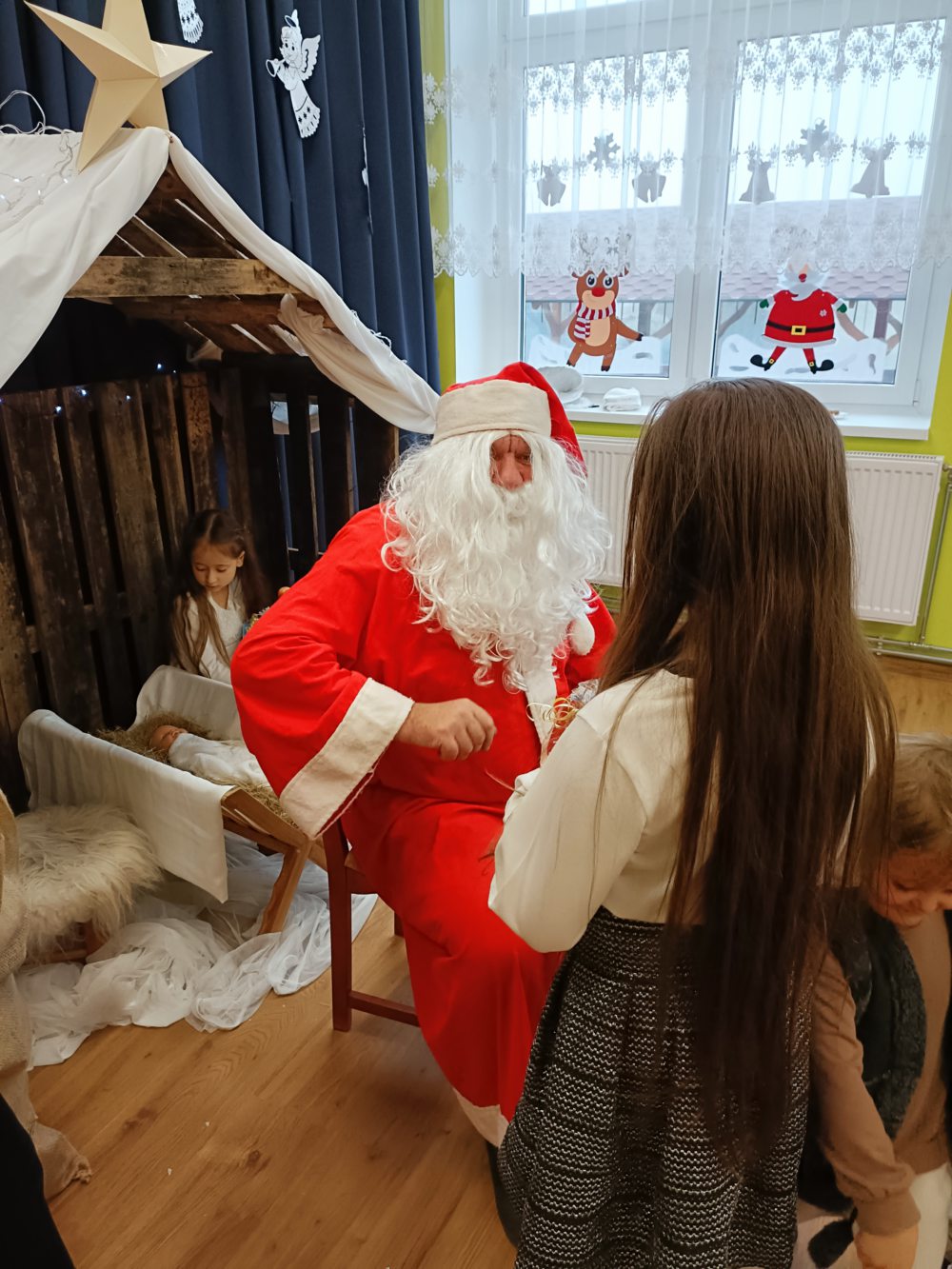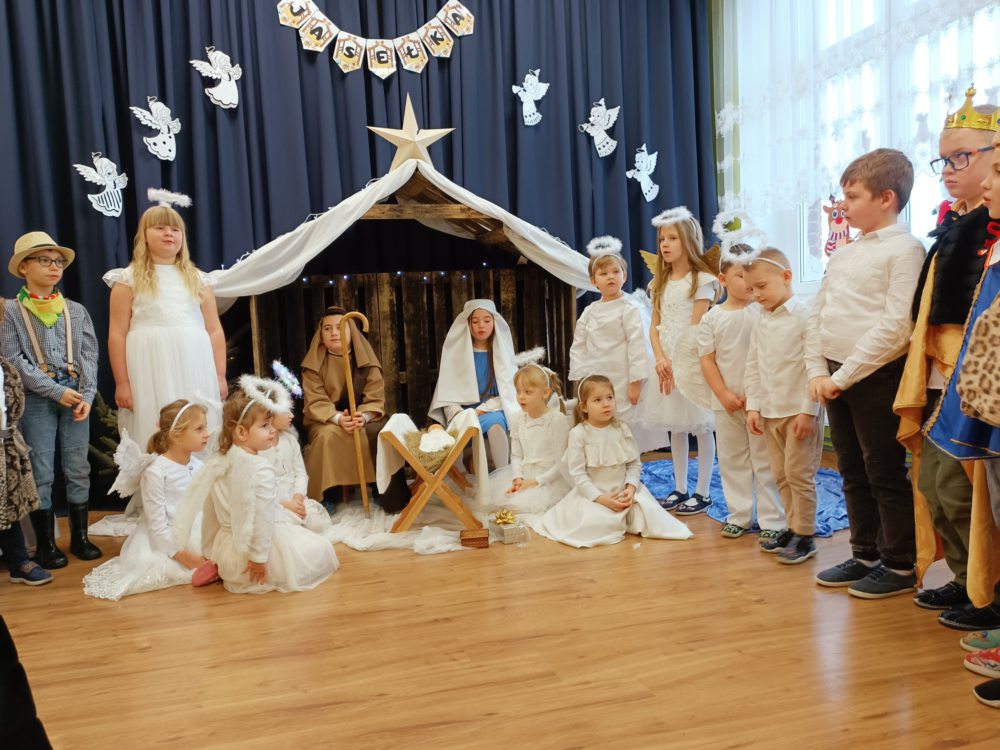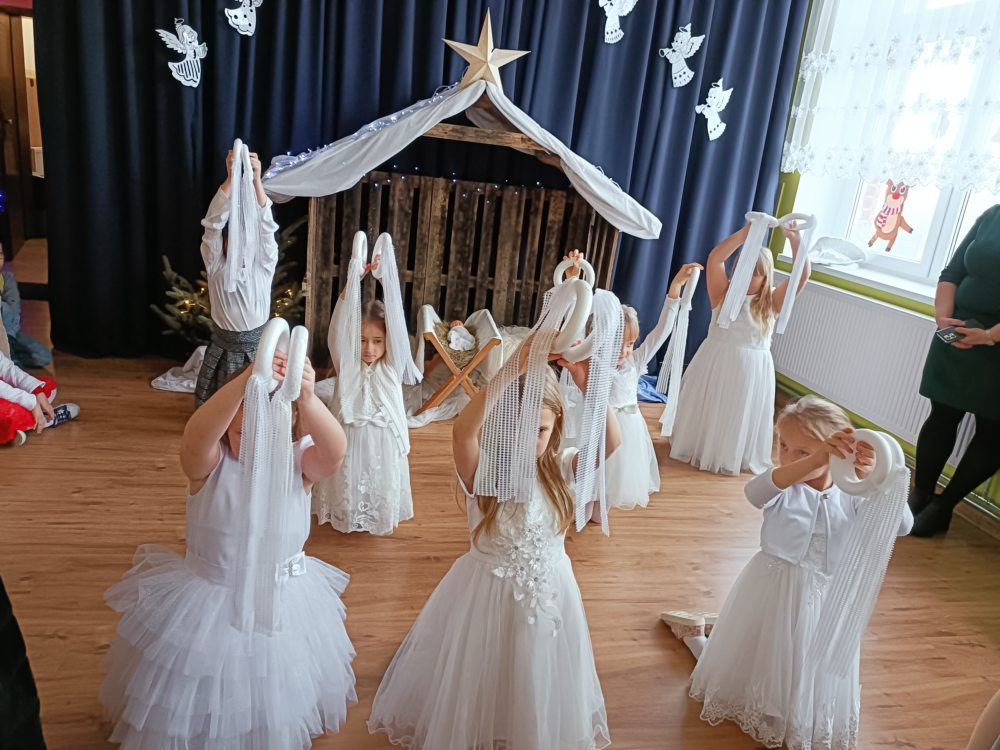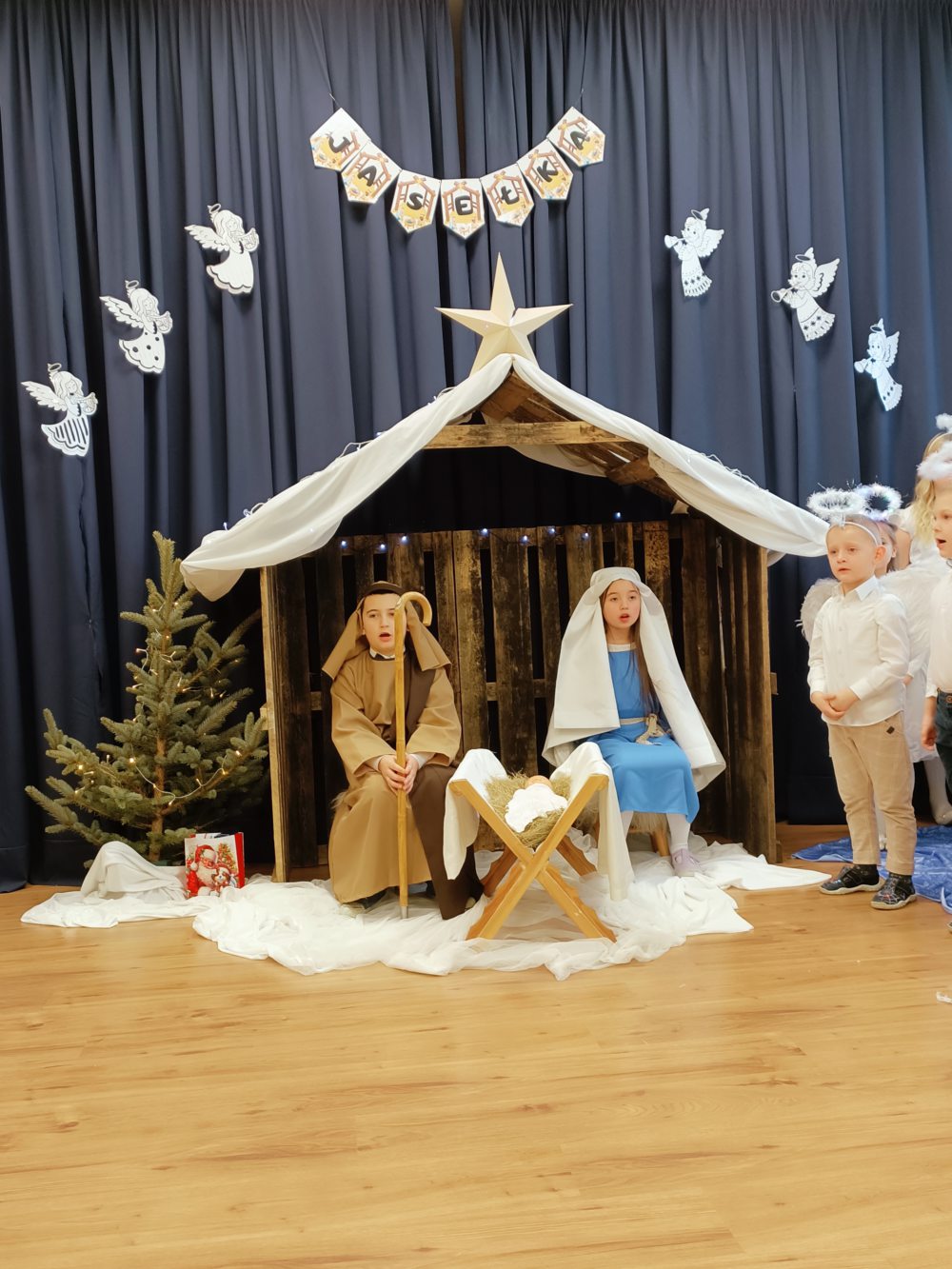 W naszej szkole odbyły się wyjątkowe jasełka, na które zostali zaproszeni rodzice oraz goście. Sala była pięknie udekorowana, a nad szopką świeciła jasna gwiazda betlejemska, wprowadzając wszystkich w świąteczny nastrój. Przedstawienie było bardzo piękne i wzruszające. Następnie na scenie pojawiły się anioły, które wykonały delikatny i pełen wdzięku taniec. Ich białe stroje oraz spokojna muzyka sprawiły, że publiczność z zapartym tchem oglądała występ. Rodzice z dumą i radością obserwowali swoje dzieci, nagradzając je gromkimi brawami. W dalszej części jasełek pojawił się Gwiazdor, który wniósł wiele radości i uśmiechu oraz przypomniał wszystkim o tym, co w świętach jest najważniejsze – miłości, dobroci i wspólnym byciu razem.