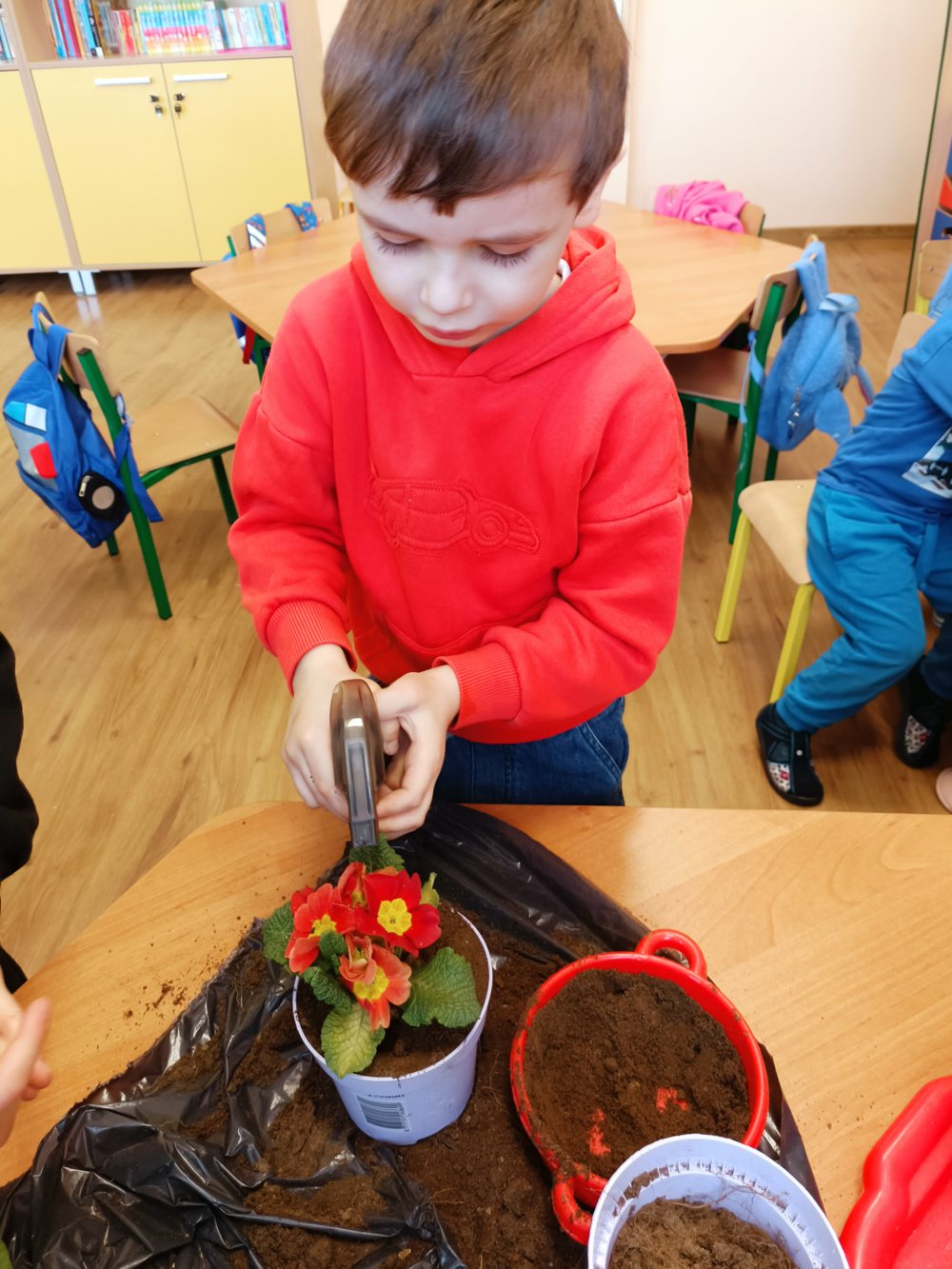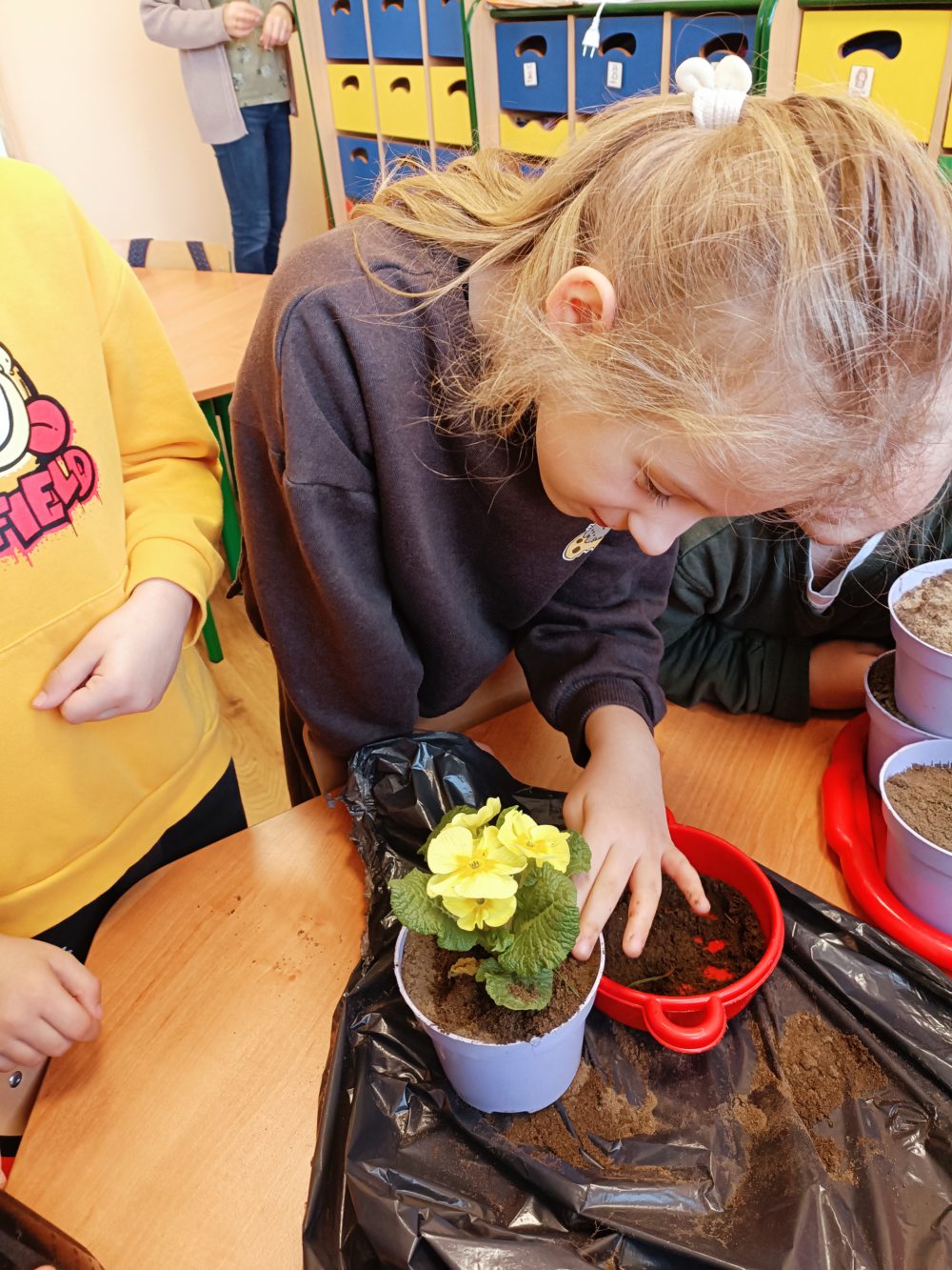W naszej szkole odbyły się wyjątkowe zajęcia przyrodnicze, podczas których najmłodsi mieli okazję bliżej poznać świat roślin. Dzieci wybrały się na świeże powietrze, gdzie z wielkim zaangażowaniem przygotowywały podłoże do sadzenia. Zabawa na dworze sprawiła wiele radości, a przy okazji mogły rozwijać swoją sprawność ruchową i współpracę w grupie. Następnie, już w sali, dzieci samodzielnie sadziły kwiaty do doniczek. Każdy mógł poczuć się jak mały ogrodnik! Uczyły się, jak dbać o rośliny, podlewać je i troszczyć się o ich wzrost.