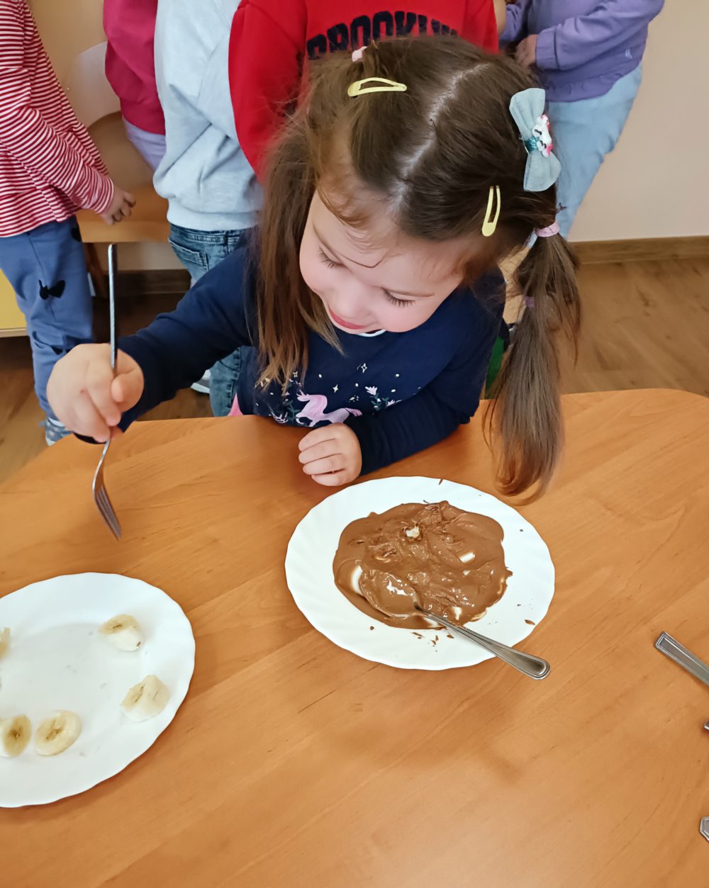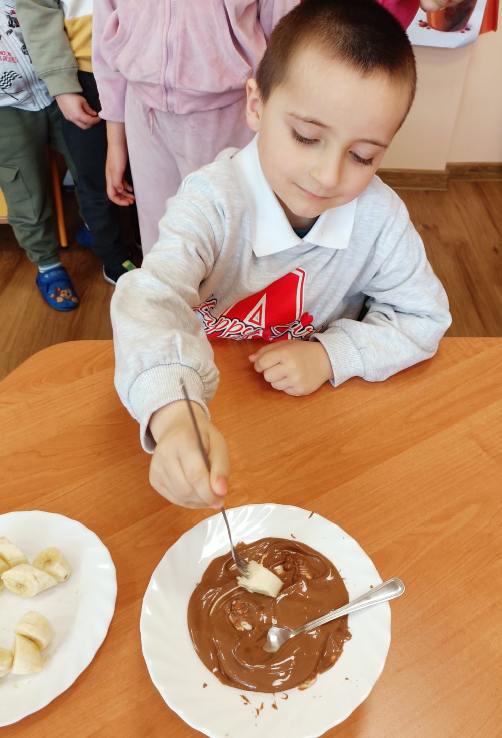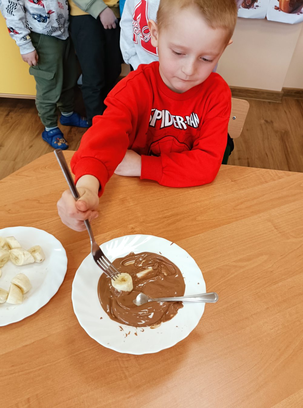 W naszej szkole odbył się wyjątkowy i pełen radości Dzień Czekolady, który dostarczył nie tylko wielu słodkich wrażeń, ale również cennej wiedzy i świetnej zabawy. Podczas zajęć dzieci dowiedziały się, jak powstaje czekolada, od ziaren kakaowca aż po gotowy produkt. Poznały roślinę, jaką jest kakaowiec, zobaczyły, jak wyglądają jego owoce oraz dowiedziały się, w jaki sposób z ziaren powstaje kakao i czekolada. Była to fascynująca podróż do świata smaków i zapachów. Nie zabrakło również aktywności ruchowych, które wprowadziły wszystkich w doskonały nastrój. Dzieci chętnie uczestniczyły w zabawach ruchowych oraz tańcach przy muzyce i piosenkach tematycznie związanych ze słodkim świętem. Dużym zainteresowaniem cieszyły się także zajęcia plastyczne. Uczniowie tworzyli kolorowe prace, rozwijając swoją kreatywność i zdolności manualne. Każde dzieło było wyjątkowe i pełne dziecięcej wyobraźni. Największą atrakcją dnia okazała się jednak degustacja bananów zanurzanych w czekoladzie. Dzieci z ogromnym zaangażowaniem przygotowywały swoje słodkie przekąski, a ich radość podczas smakowania była bezcenna.