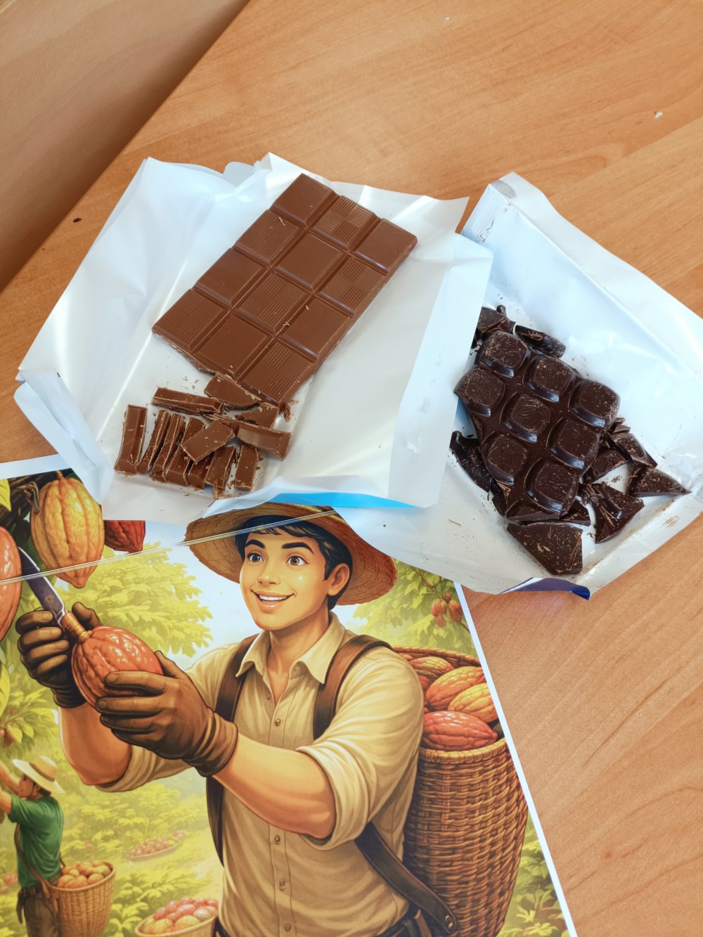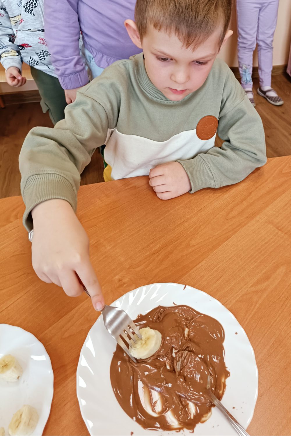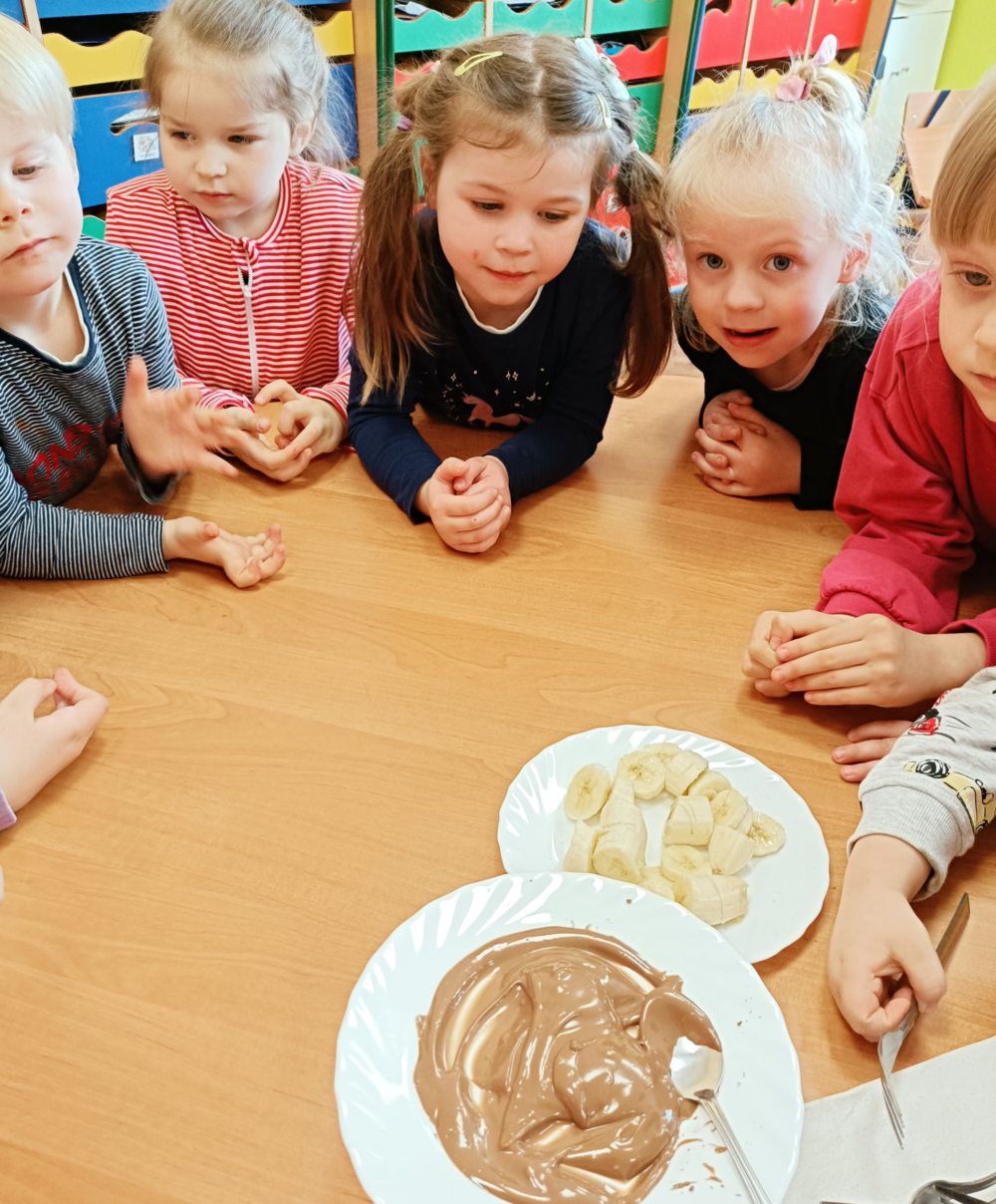W naszej szkole odbył się wyjątkowy i pełen radości Dzień Czekolady, który dostarczył nie tylko wielu słodkich wrażeń, ale również cennej wiedzy i świetnej zabawy. Podczas zajęć dzieci dowiedziały się, jak powstaje czekolada, od ziaren kakaowca aż po gotowy produkt. Poznały roślinę, jaką jest kakaowiec, zobaczyły, jak wyglądają jego owoce oraz dowiedziały się, w jaki sposób z ziaren powstaje kakao i czekolada. Była to fascynująca podróż do świata smaków i zapachów. Nie zabrakło również aktywności ruchowych, które wprowadziły wszystkich w doskonały nastrój. Dzieci chętnie uczestniczyły w zabawach ruchowych oraz tańcach przy muzyce i piosenkach tematycznie związanych ze słodkim świętem. Dużym zainteresowaniem cieszyły się także zajęcia plastyczne. Uczniowie tworzyli kolorowe prace, rozwijając swoją kreatywność i zdolności manualne. Każde dzieło było wyjątkowe i pełne dziecięcej wyobraźni. Największą atrakcją dnia okazała się jednak degustacja bananów zanurzanych w czekoladzie. Dzieci z ogromnym zaangażowaniem przygotowywały swoje słodkie przekąski, a ich radość podczas smakowania była bezcenna.