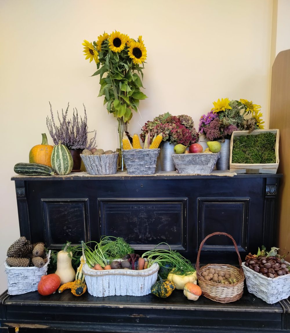 Jesień zagościła w naszym przedszkolu na dobre! Dzieci z wielkim zaangażowaniem przynosiły do sali prawdziwe skarby jesieni – kasztany, orzechy, żołędzie, kolorowe liście, szyszki, a także jesienne warzywa i owoce. Nie zabrakło również pięknych słoneczników i hortensji, które dodały naszemu kącikowi wyjątkowego uroku. Wspólnie stworzyliśmy „Kącik z Darami Jesieni”, który stał się nie tylko ozdobą sali, ale także inspiracją do rozmów, zabaw i zajęć o zmianach zachodzących w przyrodzie. Dzieci z radością opowiadały, skąd pochodzą przyniesione skarby, a podczas jesiennego spaceru obserwowały przyrodę, zbierały liście i poznawały różnorodność barw tej pięknej pory roku. Nasz kącik przypomina, że jesień to czas pełen kolorów, zapachów i wspaniałych odkryć – wystarczy tylko rozejrzeć się wokół i zachwycić bogactwem natury!