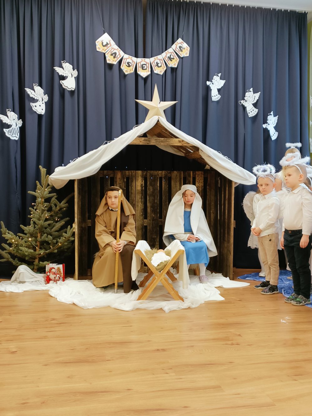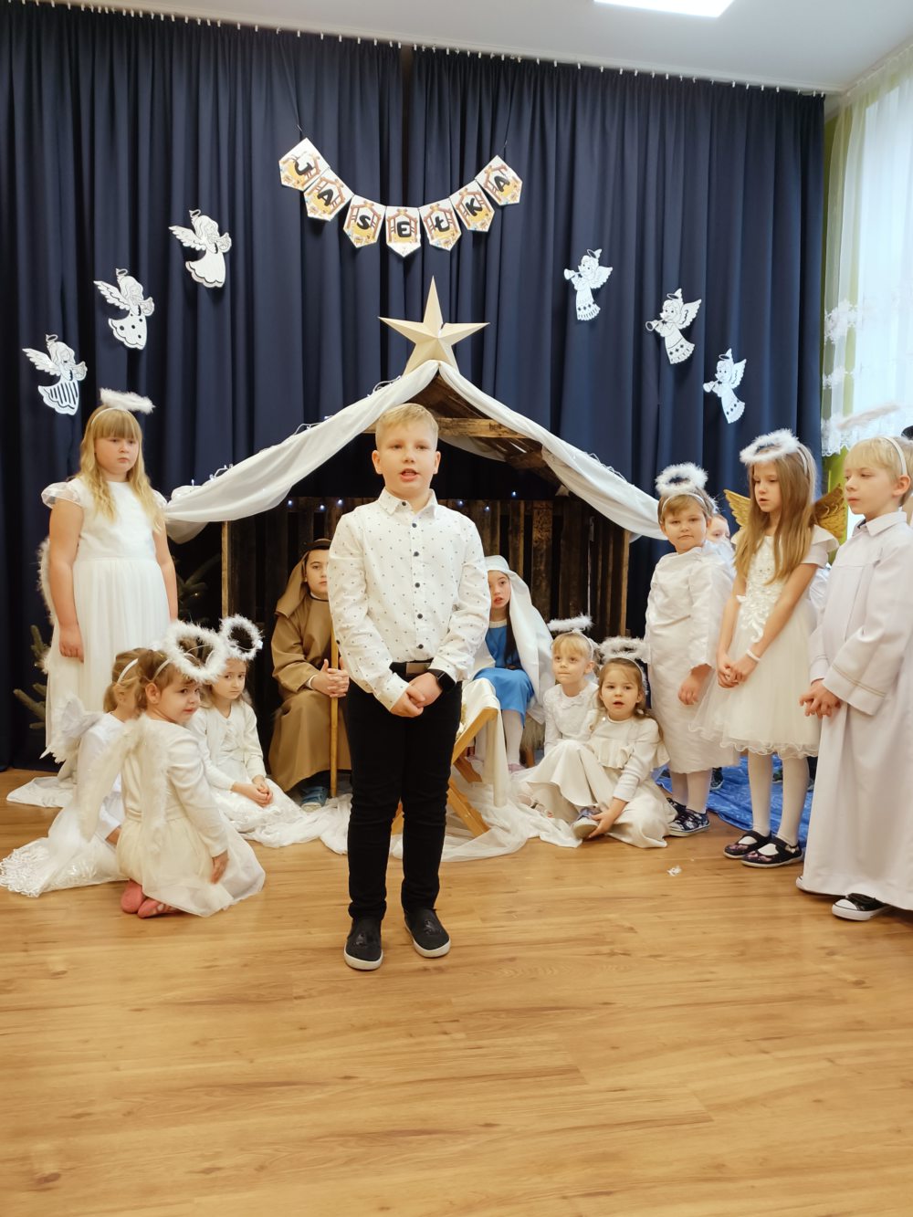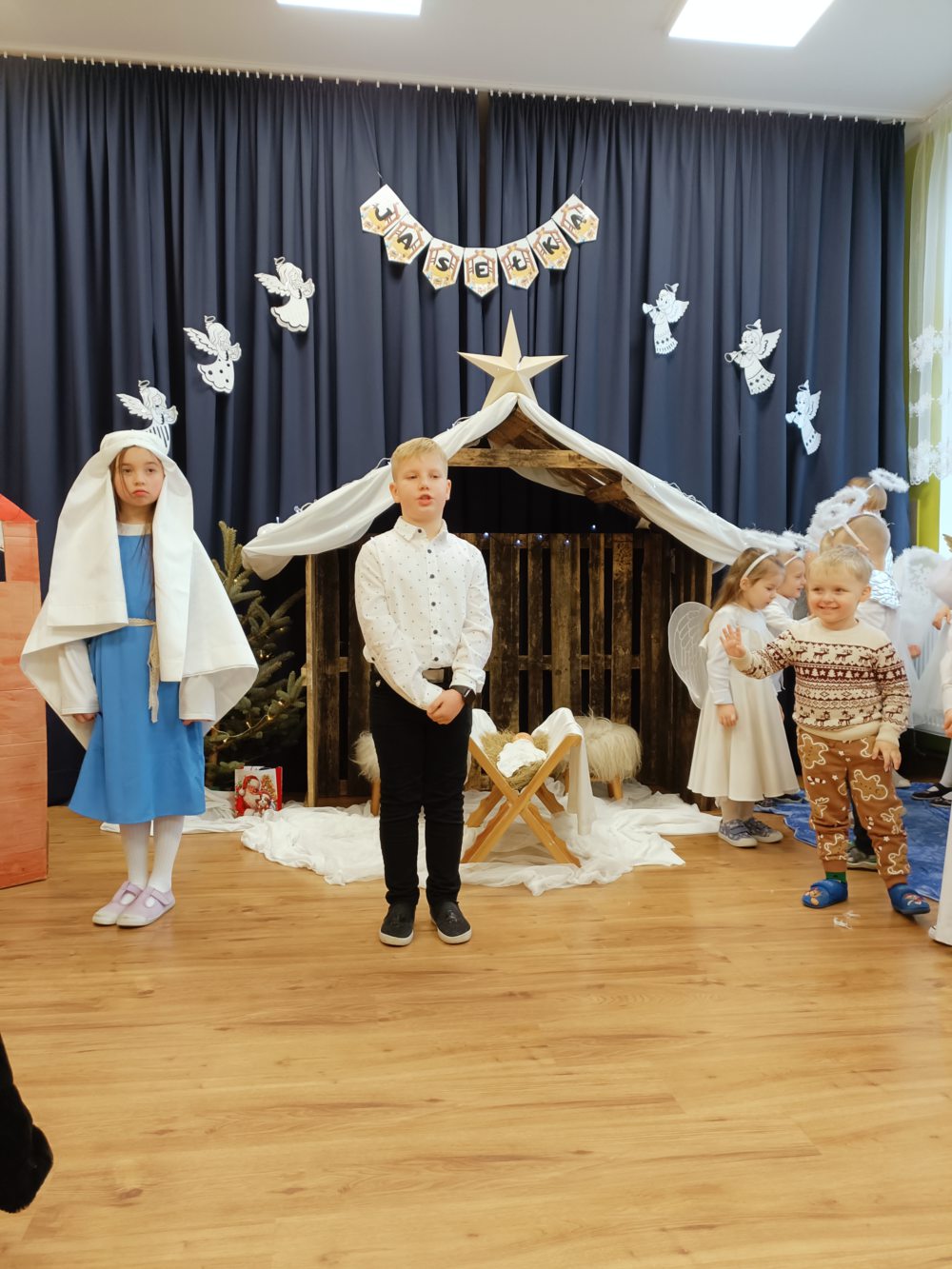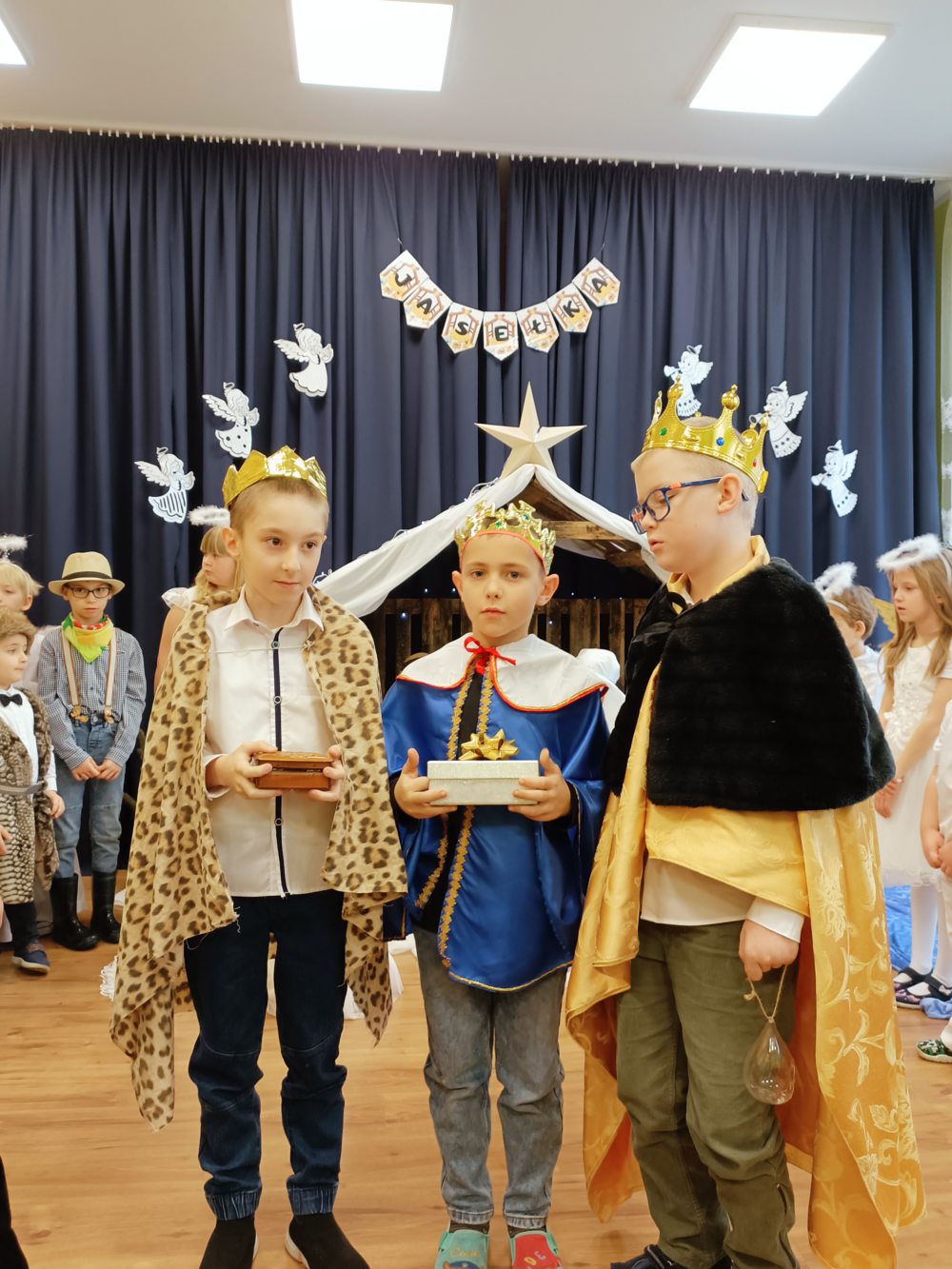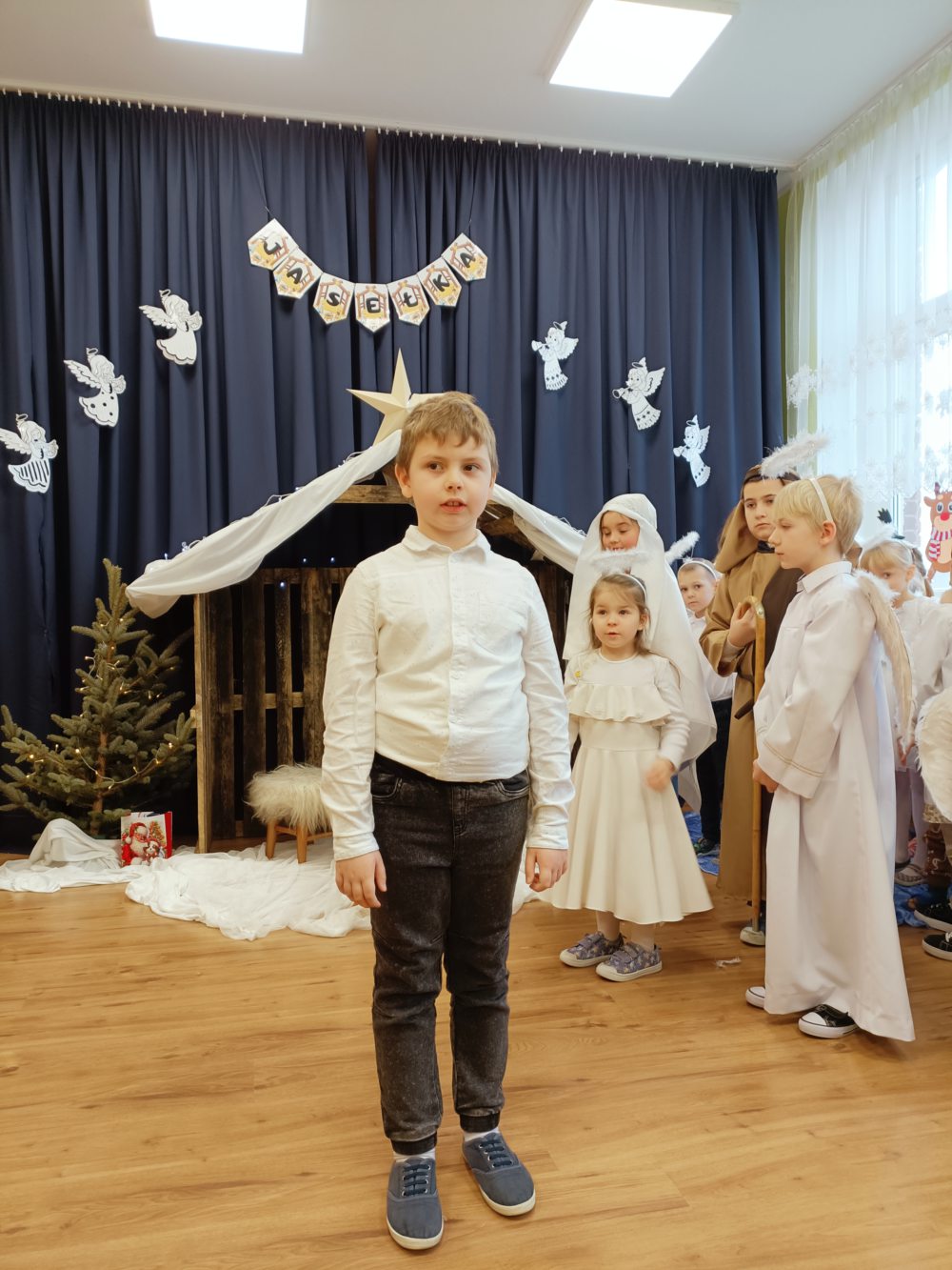 W naszej szkole odbyły się wyjątkowe jasełka, na które zostali zaproszeni rodzice oraz goście. Sala była pięknie udekorowana, a nad szopką świeciła jasna gwiazda betlejemska, wprowadzając wszystkich w świąteczny nastrój. Przedstawienie było bardzo piękne i wzruszające. Następnie na scenie pojawiły się anioły, które wykonały delikatny i pełen wdzięku taniec. Ich białe stroje oraz spokojna muzyka sprawiły, że publiczność z zapartym tchem oglądała występ. Rodzice z dumą i radością obserwowali swoje dzieci, nagradzając je gromkimi brawami. W dalszej części jasełek pojawił się Gwiazdor, który wniósł wiele radości i uśmiechu oraz przypomniał wszystkim o tym, co w świętach jest najważniejsze – miłości, dobroci i wspólnym byciu razem.