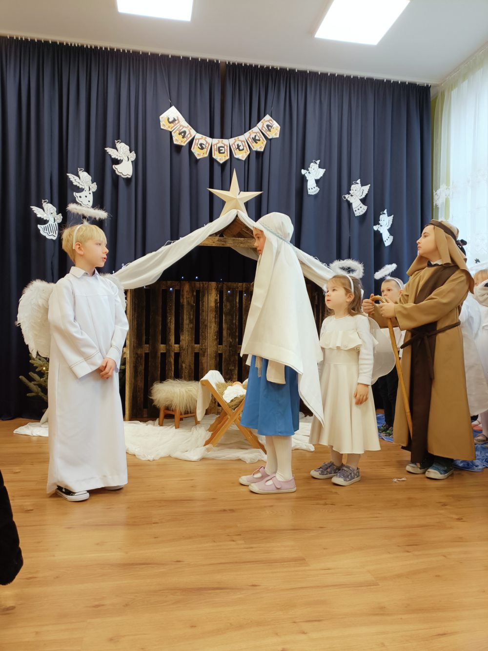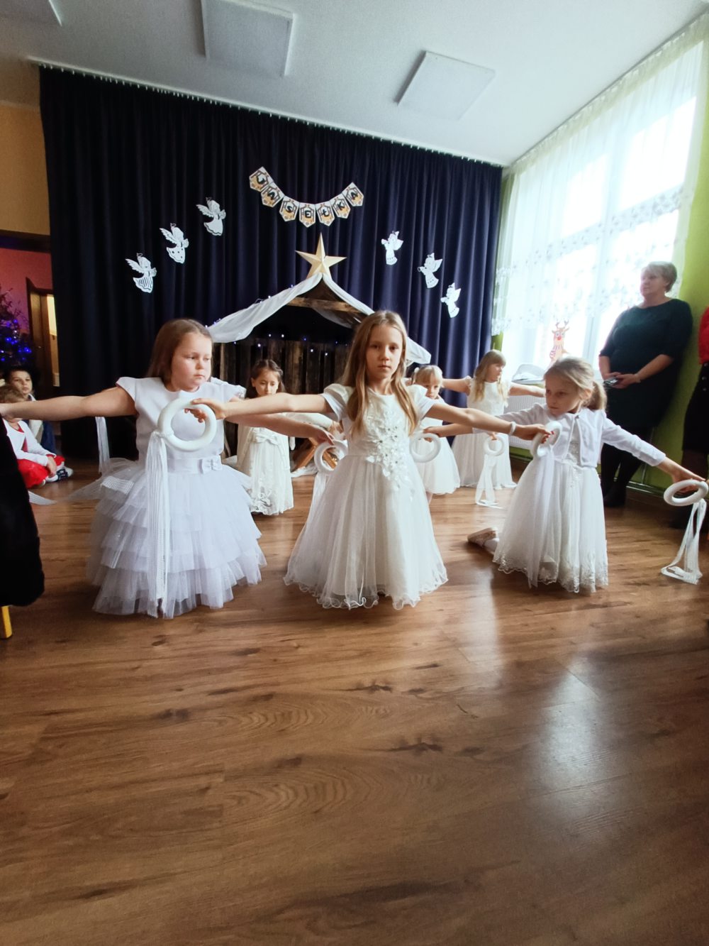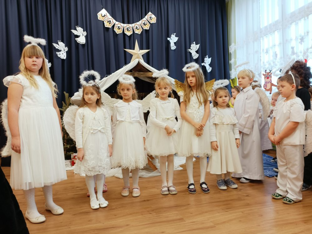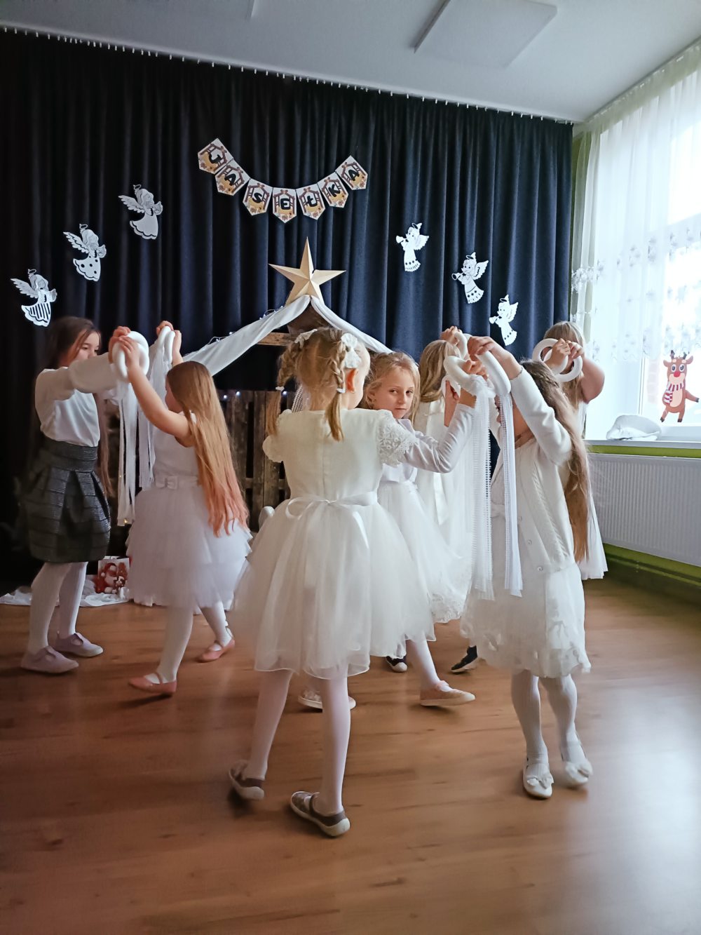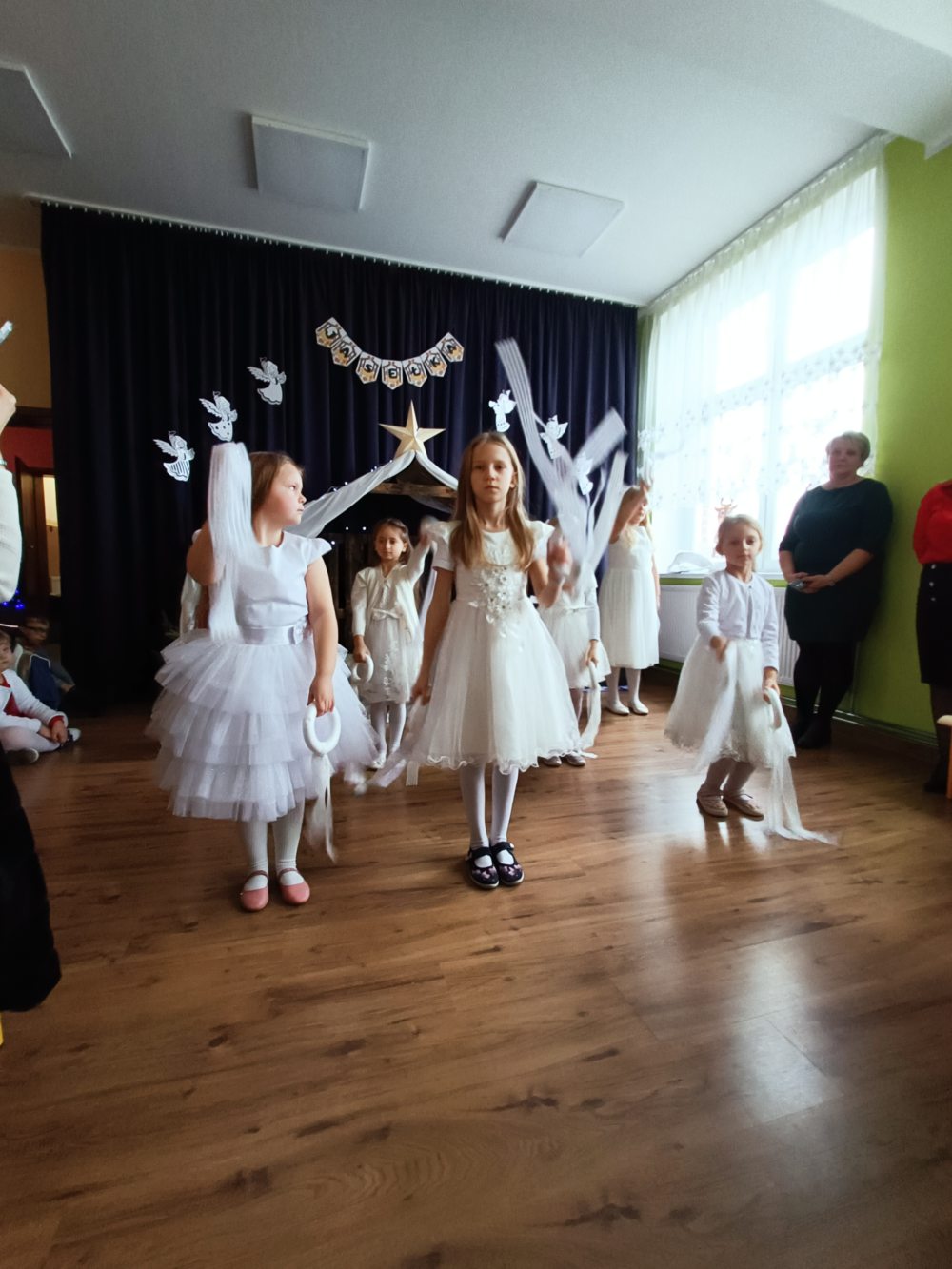 W naszej szkole odbyły się wyjątkowe jasełka, na które zostali zaproszeni rodzice oraz goście. Sala była pięknie udekorowana, a nad szopką świeciła jasna gwiazda betlejemska, wprowadzając wszystkich w świąteczny nastrój. Przedstawienie było bardzo piękne i wzruszające. Następnie na scenie pojawiły się anioły, które wykonały delikatny i pełen wdzięku taniec. Ich białe stroje oraz spokojna muzyka sprawiły, że publiczność z zapartym tchem oglądała występ. Rodzice z dumą i radością obserwowali swoje dzieci, nagradzając je gromkimi brawami. W dalszej części jasełek pojawił się Gwiazdor, który wniósł wiele radości i uśmiechu oraz przypomniał wszystkim o tym, co w świętach jest najważniejsze – miłości, dobroci i wspólnym byciu razem.