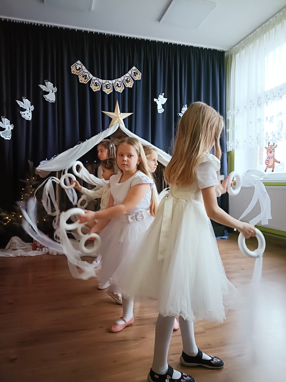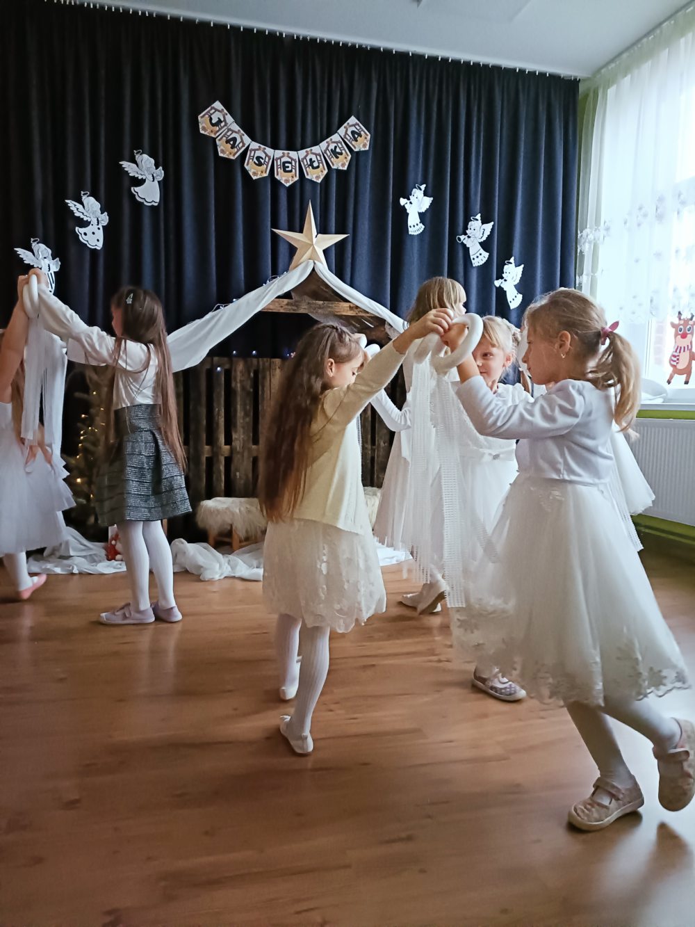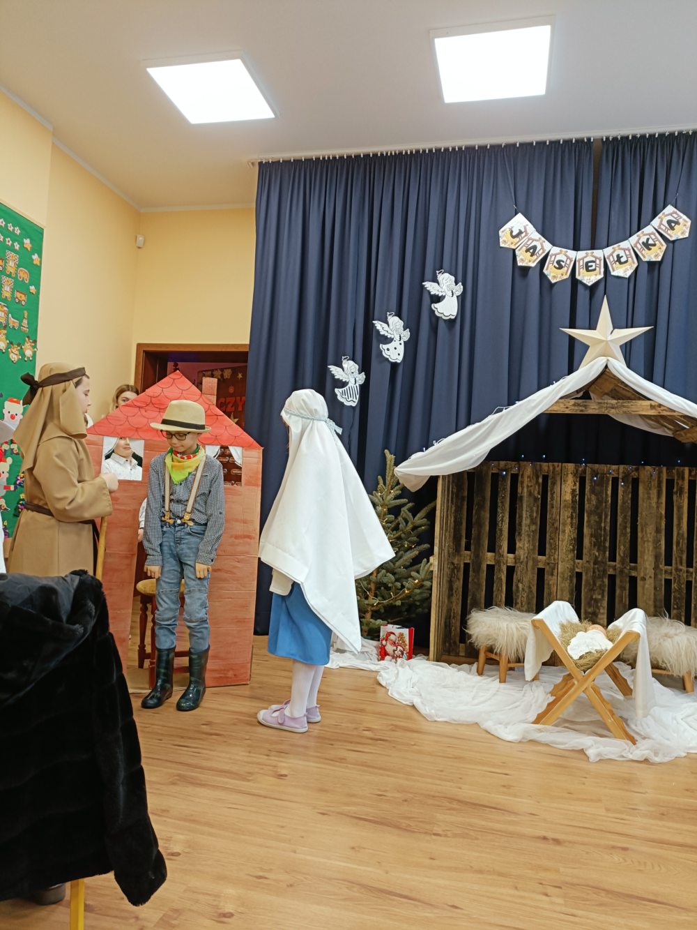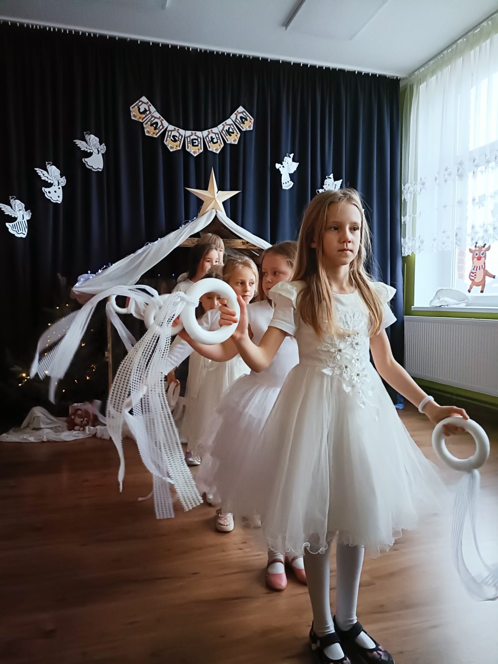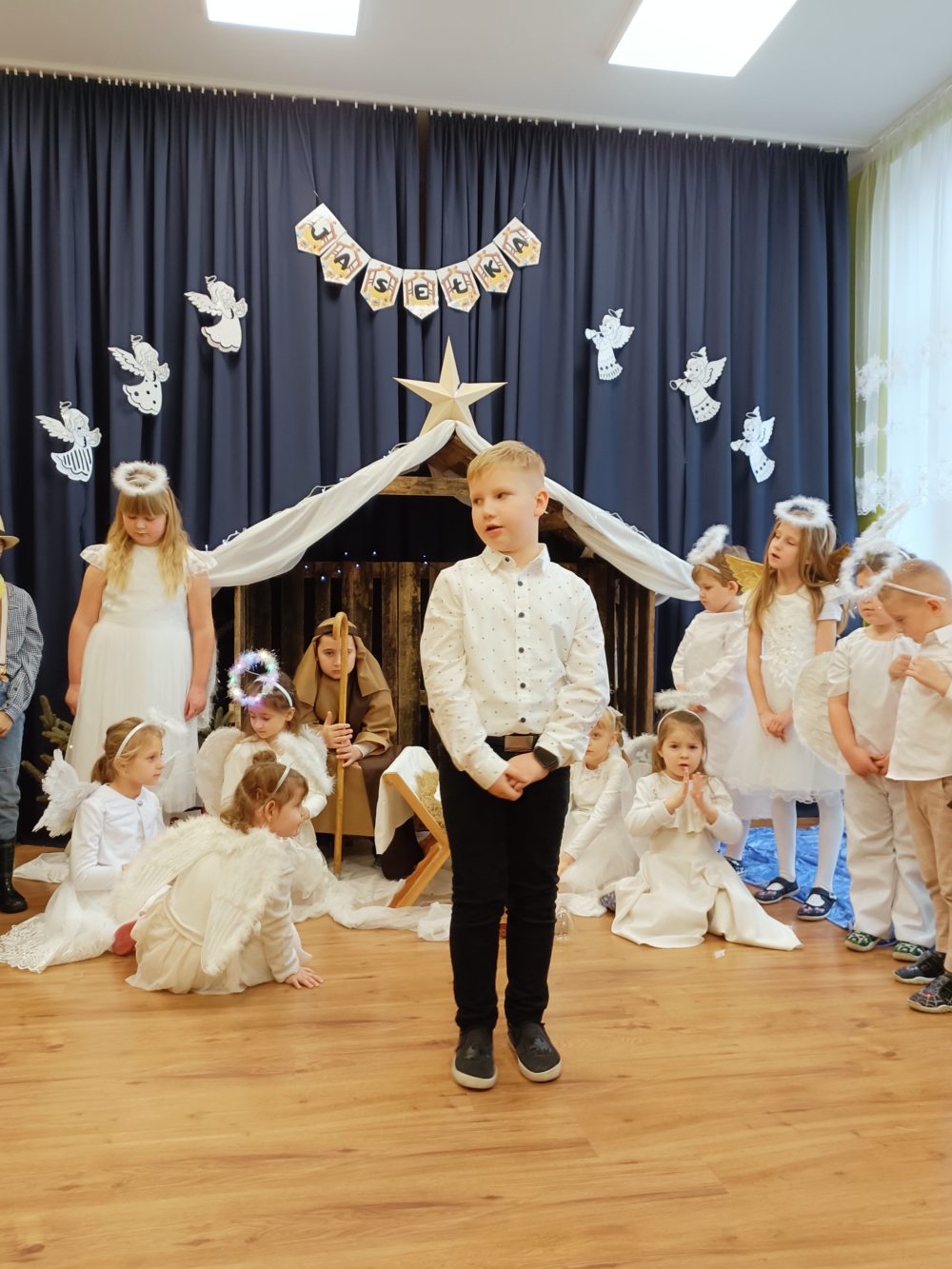 W naszej szkole odbyły się wyjątkowe jasełka, na które zostali zaproszeni rodzice oraz goście. Sala była pięknie udekorowana, a nad szopką świeciła jasna gwiazda betlejemska, wprowadzając wszystkich w świąteczny nastrój. Przedstawienie było bardzo piękne i wzruszające. Następnie na scenie pojawiły się anioły, które wykonały delikatny i pełen wdzięku taniec. Ich białe stroje oraz spokojna muzyka sprawiły, że publiczność z zapartym tchem oglądała występ. Rodzice z dumą i radością obserwowali swoje dzieci, nagradzając je gromkimi brawami. W dalszej części jasełek pojawił się Gwiazdor, który wniósł wiele radości i uśmiechu oraz przypomniał wszystkim o tym, co w świętach jest najważniejsze – miłości, dobroci i wspólnym byciu razem.