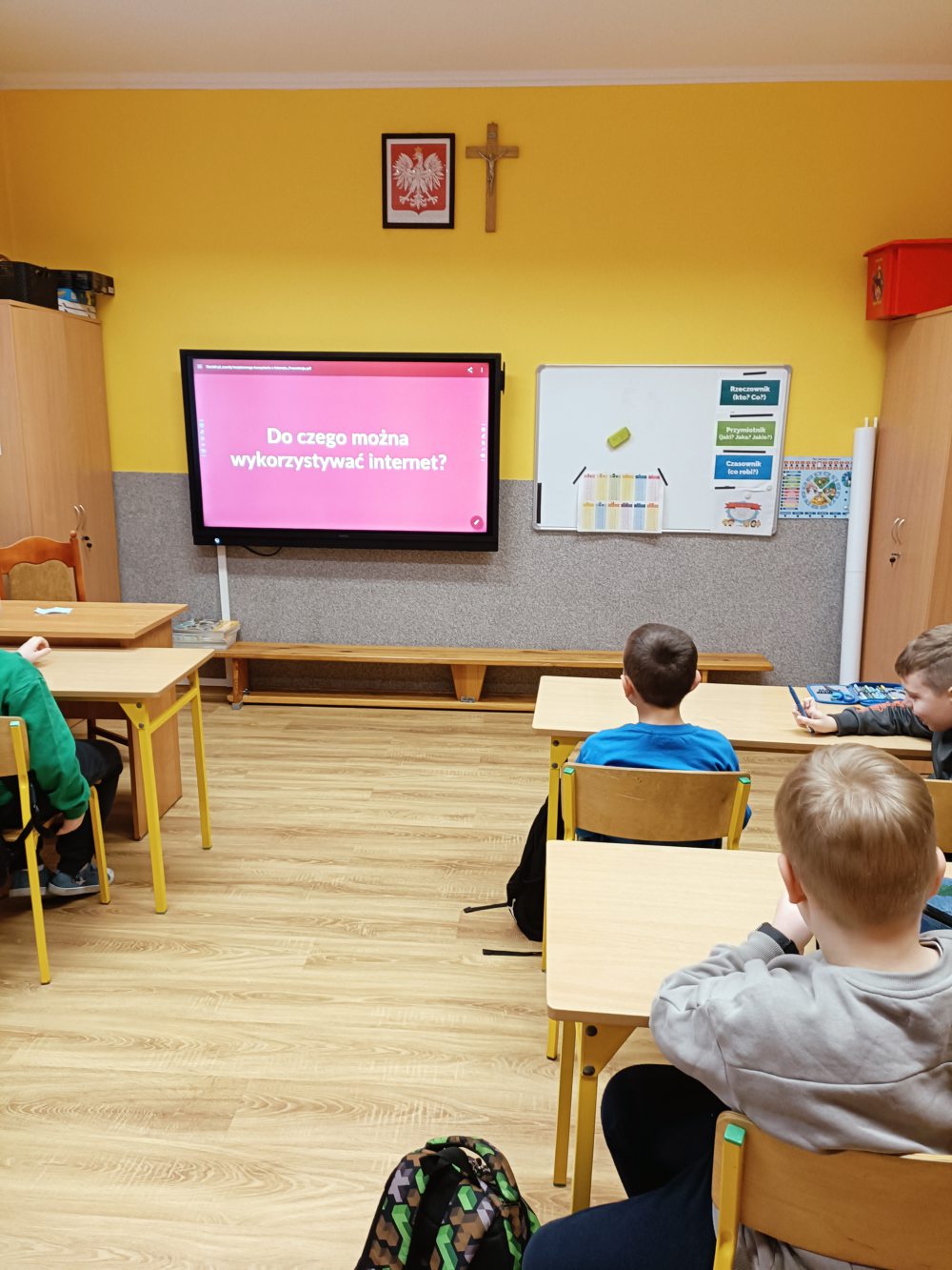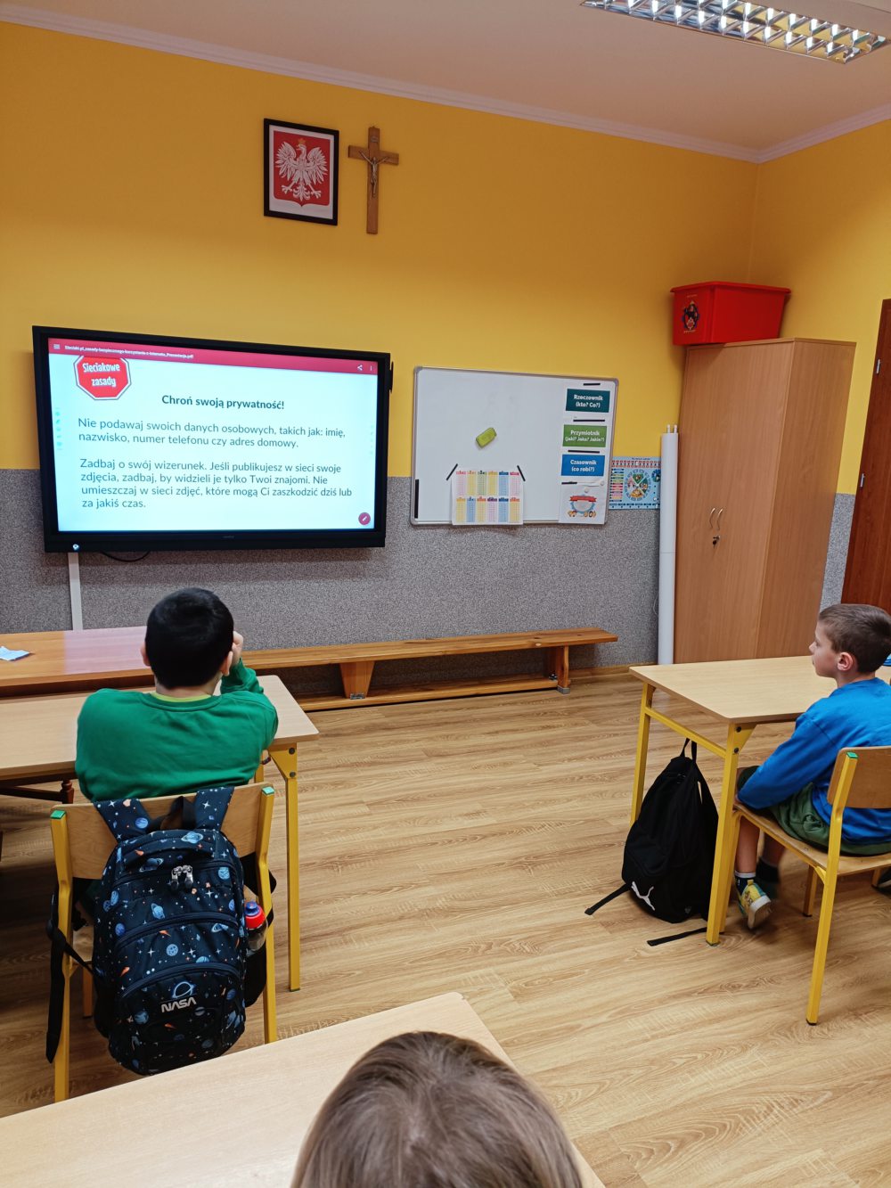 10 lutego obchodziliśmy Dzień Bezpiecznego Internetu, którego celem było promowanie bezpiecznego i odpowiedzialnego korzystania z sieci. Uczniowie aktywnie uczestniczyli w zajęciach edukacyjnych, które w ciekawy i przystępny sposób przybliżyły im zasady bezpieczeństwa online. Podczas spotkania omówiliśmy najważniejsze zasady korzystania z internetu, m.in.: ochronę danych osobowych, tworzenie bezpiecznych haseł, zachowanie ostrożności w kontaktach z nieznajomymi, reagowanie na hejt i cyberprzemoc, odpowiedzialne publikowanie treści w sieci. Uczniowie obejrzeli edukacyjne filmy sytuacyjne, które przedstawiały przykłady zagrożeń internetowych oraz właściwe sposoby reagowania w trudnych sytuacjach. Po projekcji odbyła się wspólna dyskusja, podczas której dzieci dzieliły się swoimi spostrzeżeniami i pomysłami, jak dbać o bezpieczeństwo w sieci. Nie zabrakło również elementów ruchowych i integracyjnych. Dzieci wzięły udział w zabawach tanecznych przy piosence tematycznej, które w radosnej atmosferze utrwaliły zdobyte wiadomości. Nauka poprzez zabawę sprawiła, że przekazane treści były jeszcze bardziej przystępne i zapadły uczniom w pamięć. Dzień Bezpiecznego Internetu był dla naszych uczniów nie tylko cenną lekcją, ale także okazją do wspólnej zabawy.