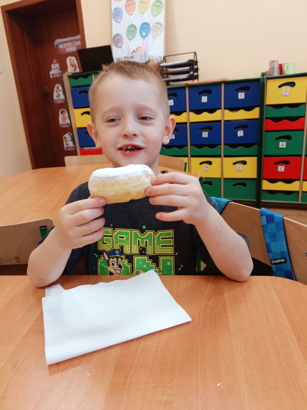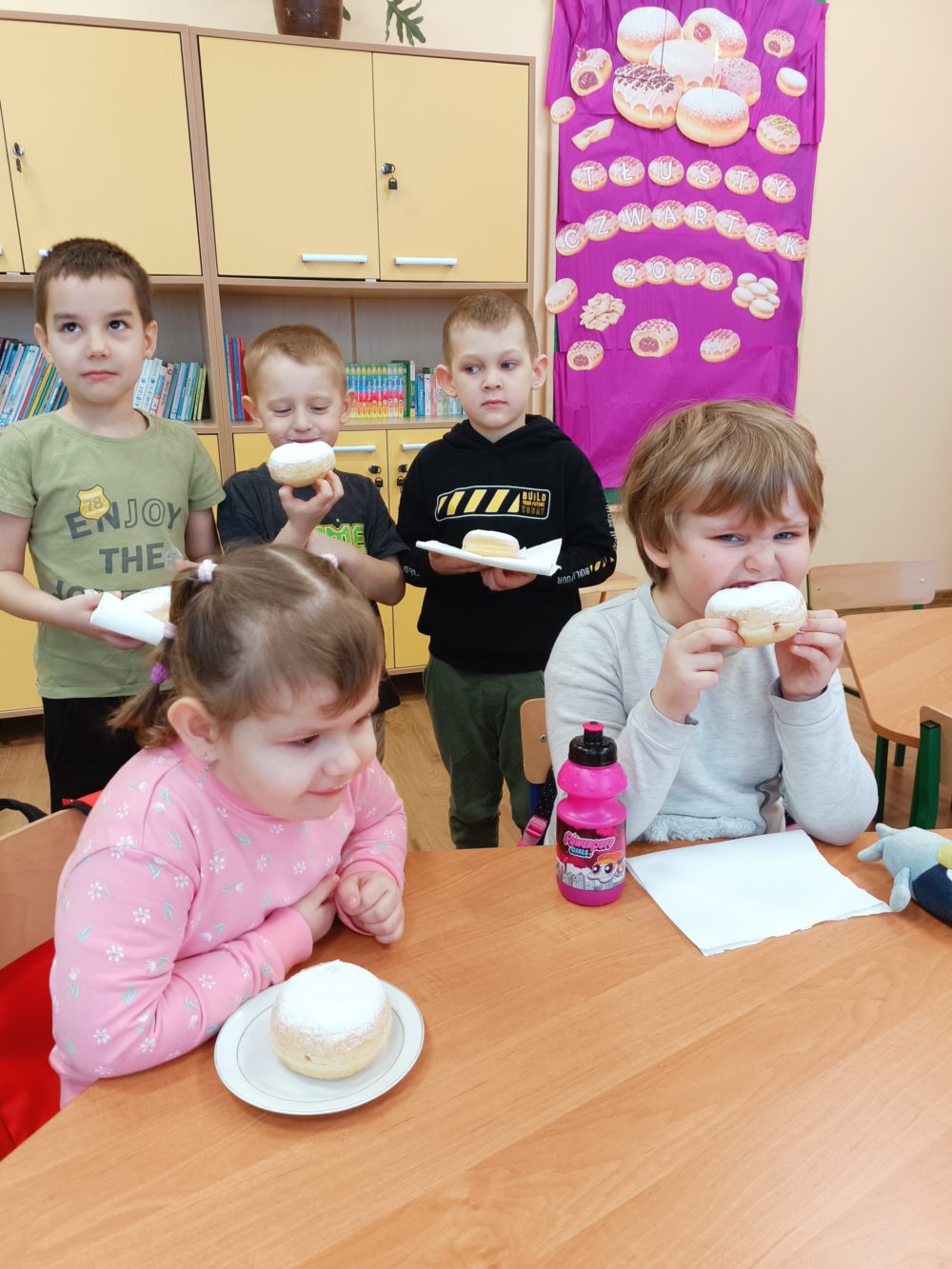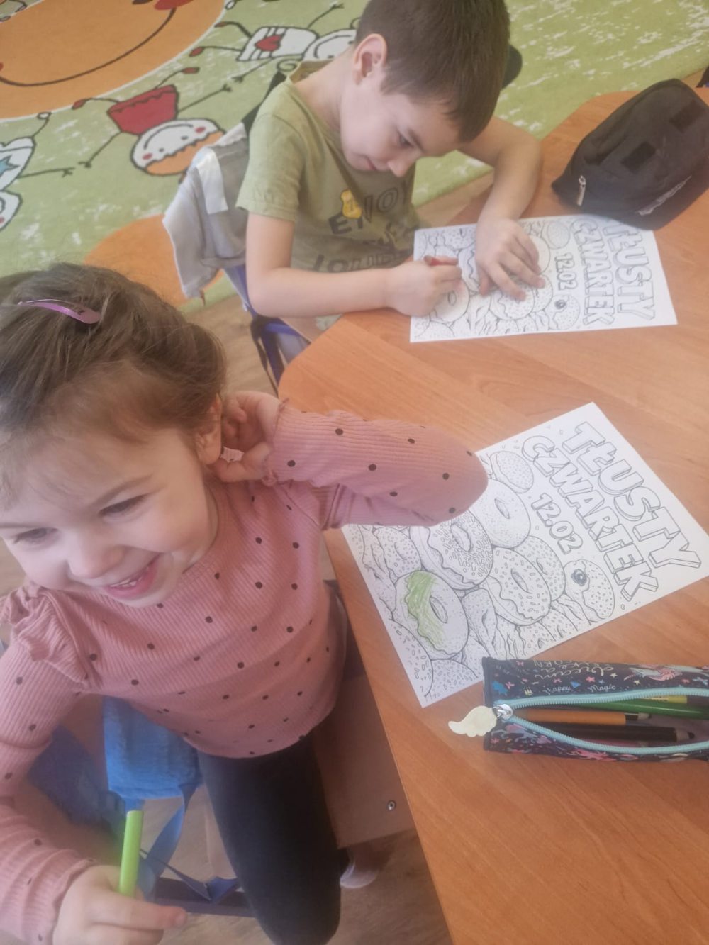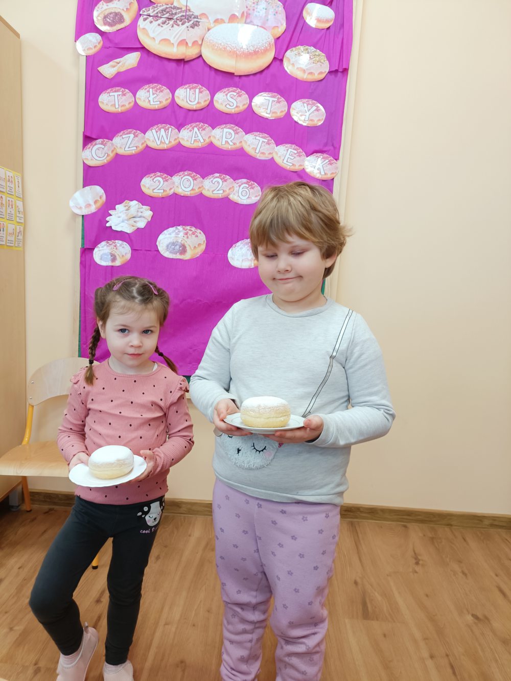 Tłusty Czwartek to jeden z najsłodszych dni w roku! W naszej sali nie mogło zabraknąć radosnej atmosfery, ciekawych zajęć oraz oczywiście… pysznych pączków. Dzieci dowiedziały się, skąd wzięła się tradycja Tłustego Czwartku oraz dlaczego właśnie tego dnia zajadamy się pączkami. Rozmawialiśmy o dawnych zwyczajach i o tym, jak świętuje się ten dzień w Polsce. Dzieci z dużym zainteresowaniem słuchały opowieści i dzieliły się swoimi doświadczeniami. Nie zabrakło także aktywności ruchowych. Były wesołe zabawy i ćwiczenia, które dostarczyły dzieciom dużo radości i uśmiechu. Wspólna zabawa sprzyjała integracji oraz budowaniu pozytywnych relacji między dziećmi. Podczas zajęć plastycznych dzieci wykonały własne pączki. Wykorzystały różne materiały, tworząc puszyste „lukrowane” wypieki. Każda praca była wyjątkowa i pełna kreatywności. Na zakończenie dnia przyszedł czas na najbardziej wyczekiwany moment, degustację prawdziwych pączków. Dzieci z apetytem zajadały słodki przysmak, pamiętając o zasadach kulturalnego zachowania przy stole. To był dzień pełen radości, uśmiechu i słodkich chwil.