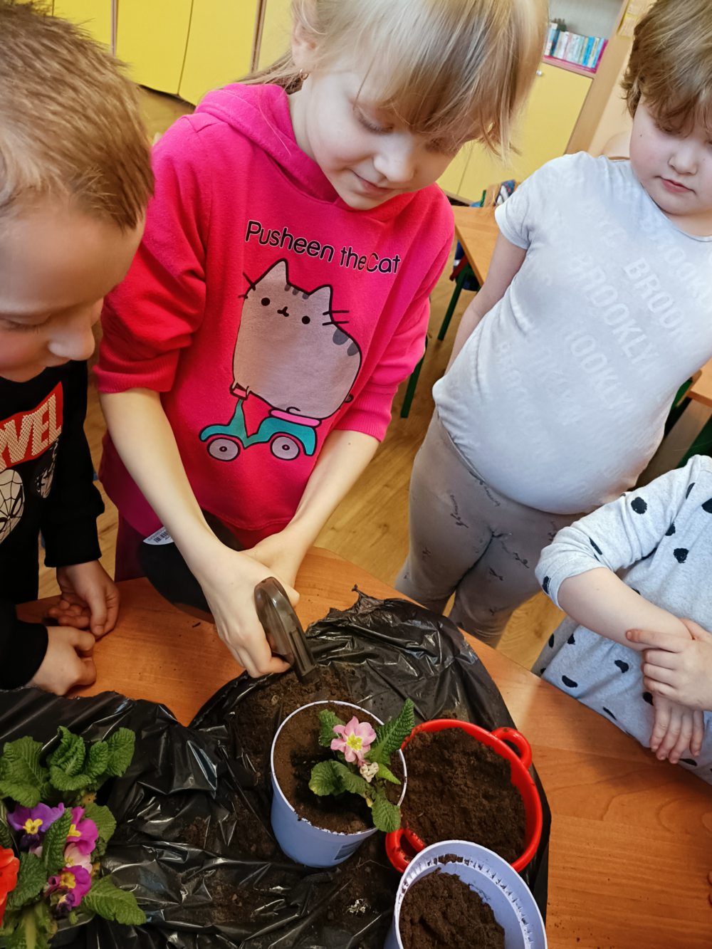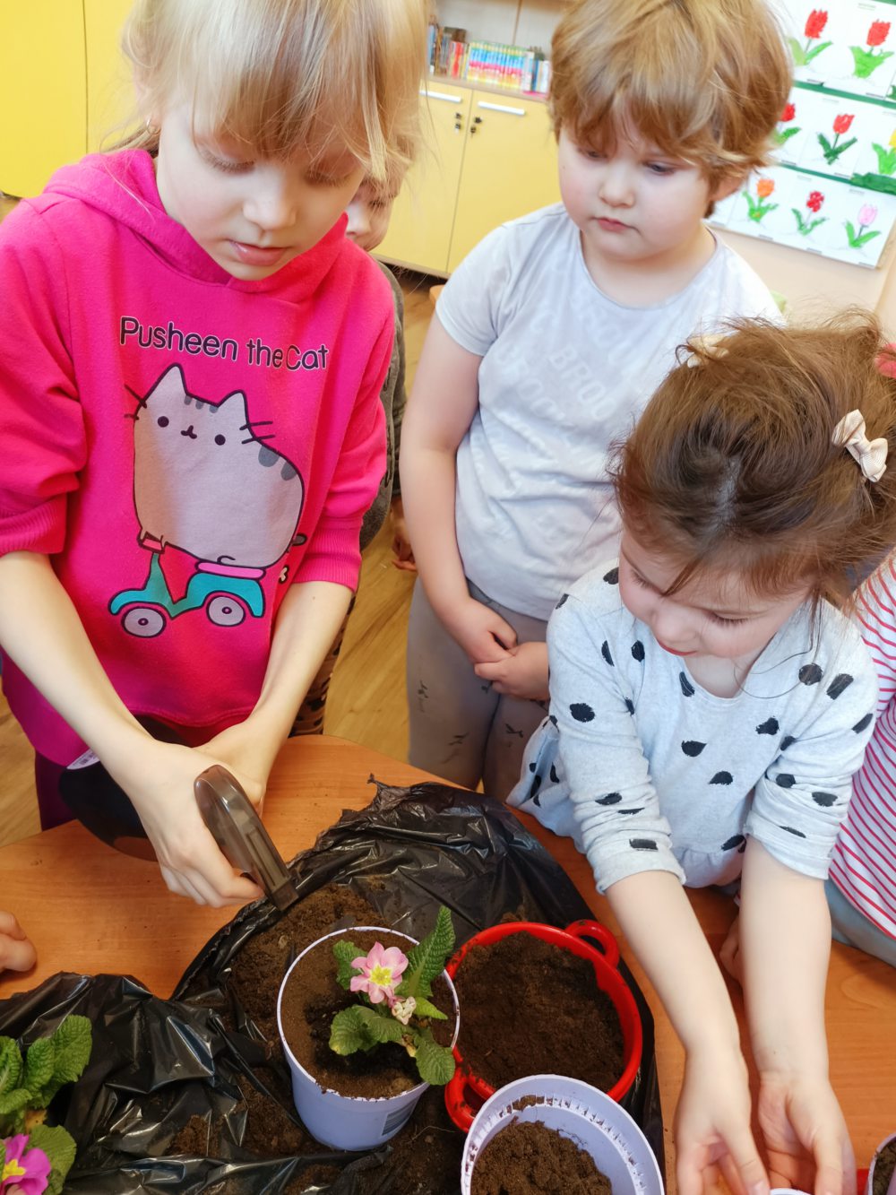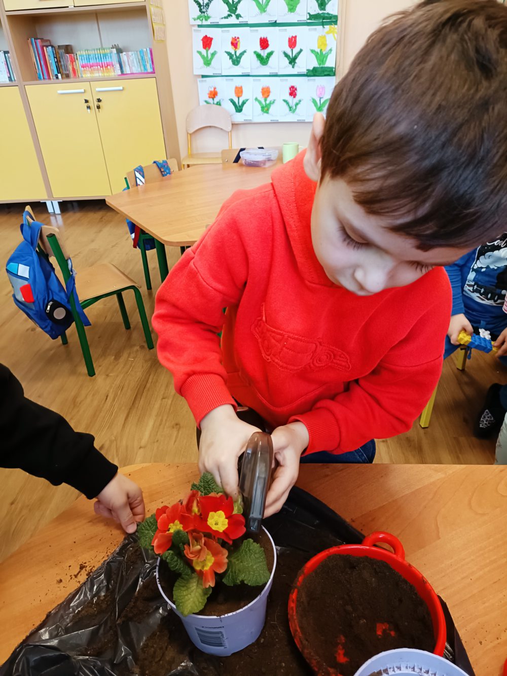 W naszej szkole odbyły się wyjątkowe zajęcia przyrodnicze, podczas których najmłodsi mieli okazję bliżej poznać świat roślin. Dzieci wybrały się na świeże powietrze, gdzie z wielkim zaangażowaniem przygotowywały podłoże do sadzenia. Zabawa na dworze sprawiła wiele radości, a przy okazji mogły rozwijać swoją sprawność ruchową i współpracę w grupie. Następnie, już w sali, dzieci samodzielnie sadziły kwiaty do doniczek. Każdy mógł poczuć się jak mały ogrodnik! Uczyły się, jak dbać o rośliny, podlewać je i troszczyć się o ich wzrost.