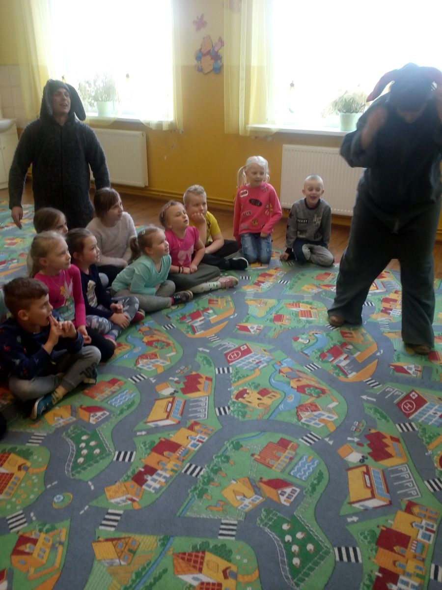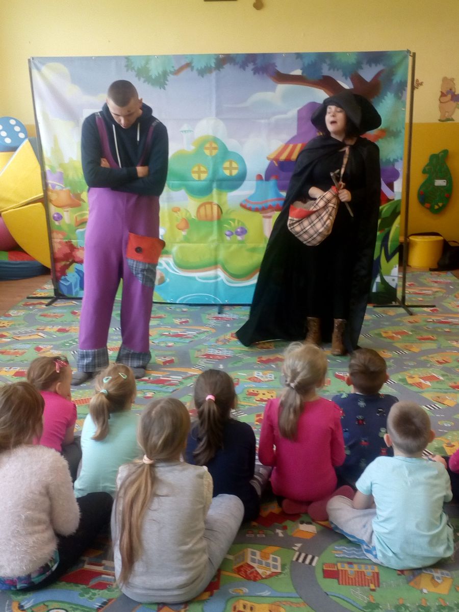 W czwartek, 27 kwietnia do naszej szkoły przybyli goście -  aktorzy Grupy T z Torunia. Zaprezentowali oni dzieciom bardzo ciekawy teatrzyk edukacyjny pt. "Zwierzakowo", którego celem jest rozwijanie empatii, wrażliwości i szacunku wobec istot żyjących. A także pokazanie małym widzom, że zwierzaki odczuwają zarówno ból jak i emocje, mają swoją niepowtarzalną osobowość oraz potrzeby.Opowieść spektaklu zaczyna się w Supełkowie, krainie zamieszkałej przez Supełki, w której nie brakuje dobrej zabawy, głośnego śmiechu, a nawet czarów. I to właśnie za sprawą magicznych mocy Supełek Maniek ostaje zamieniony w pieska za niewłaściwe zachowanie wobec zwierząt. W tym momencie zaczyna fascynująca przygoda. Bohater trafia do całkiem innego świata... Świata, w którym jego siostra Hortensja go nie rozumie.Czy dziewczynka zdoła pomóc swojemu bratu? Czego dowie się Maniek w futrzastym ciele?Czy czar przestanie działać? W trakcie fascynującej podróży po zwierzęcym świecie spotkamy się z wygadaną papugą, mądrą sową, wyluzowaną krową i innymi ciekawymi postaciami. Nie zabraknie roztargnionego czarodzieja i przebiegłego hycla.