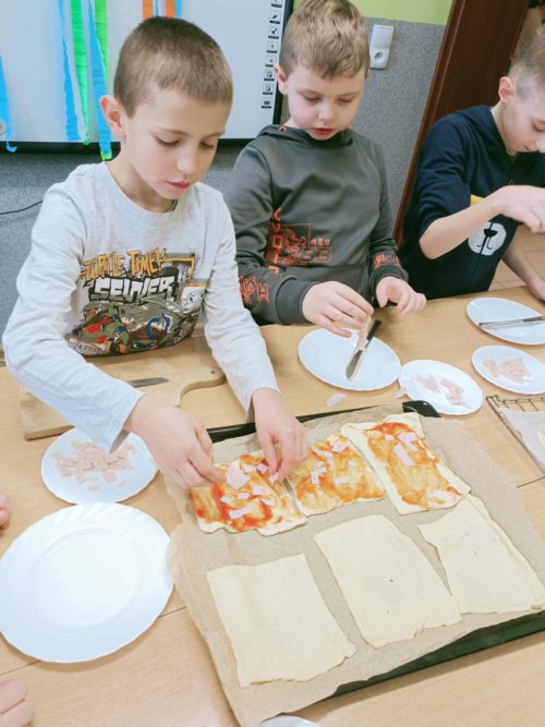 W naszej szkole świętowaliśmy wyjątkowy Dzień Pizzy, który był pełen radości, kreatywności i nauki poprzez zabawę! Podczas zajęć dzieci miały okazję wcielić się w rolę prawdziwych kucharzy. Najpierw rozmawialiśmy o tym, skąd pochodzi pizza oraz jakie składniki są potrzebne do jej przygotowania. Ogromną radość sprawiło tworzenie pizzy z elementów zabawkowych. Dzieci układały „ciasto” i dekorowały je warzywami oraz dodatkami w wersji edukacyjnej, rozwijając przy tym wyobraźnię i zdolności manualne. Podczas zajęć przeliczaliśmy składniki, dzieliliśmy pizzę na części oraz porównywaliśmy ilości produktów. Dzięki temu dzieci w praktyczny sposób utrwalały umiejętność liczenia oraz pojęcia matematyczne, takie jak więcej, mniej, tyle samo. Nie zabrakło również aktywności plastycznych – dzieci wykonywały własne prace przedstawiające pizzę, wyklejając ją kolorowym papierem i innymi materiałami. Powstały piękne, apetyczne dzieła! Na końcu dzieci samodzielnie komponowały pizzę, wybierając ulubione składniki. Dzień Pizzy był doskonałą okazją do nauki poprzez zabawę, rozwijania kreatywności oraz wspólnego, radosnego spędzania czasu.